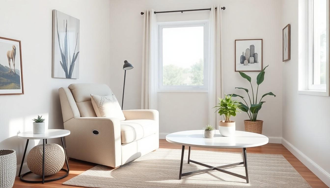 Selecting furniture that complements recliners improves the space’s overall design. Opt for sleek coffee tables, end tables, or poufs that maintain a light, open feel. Strategies like choosing transparent or lightweight materials, such as glass or acrylic, help retain visual space. Small sofas or chairs in similar color palettes create cohesion while maximizing seating. Additionally, multipurpose pieces like ottomans can offer extra storage while enhancing comfort. Ensure each item harmonizes with the recliner’s style and size.